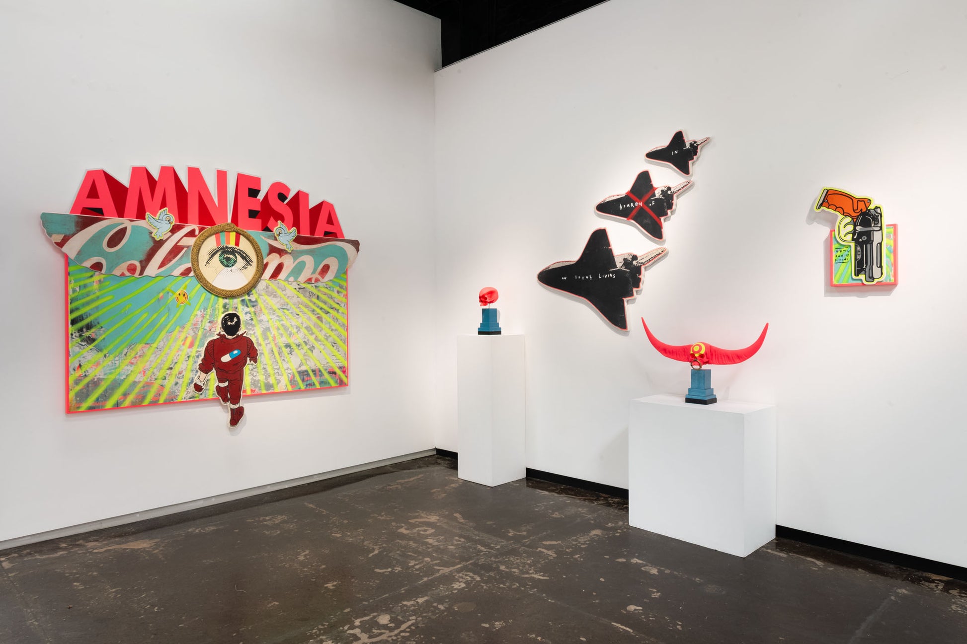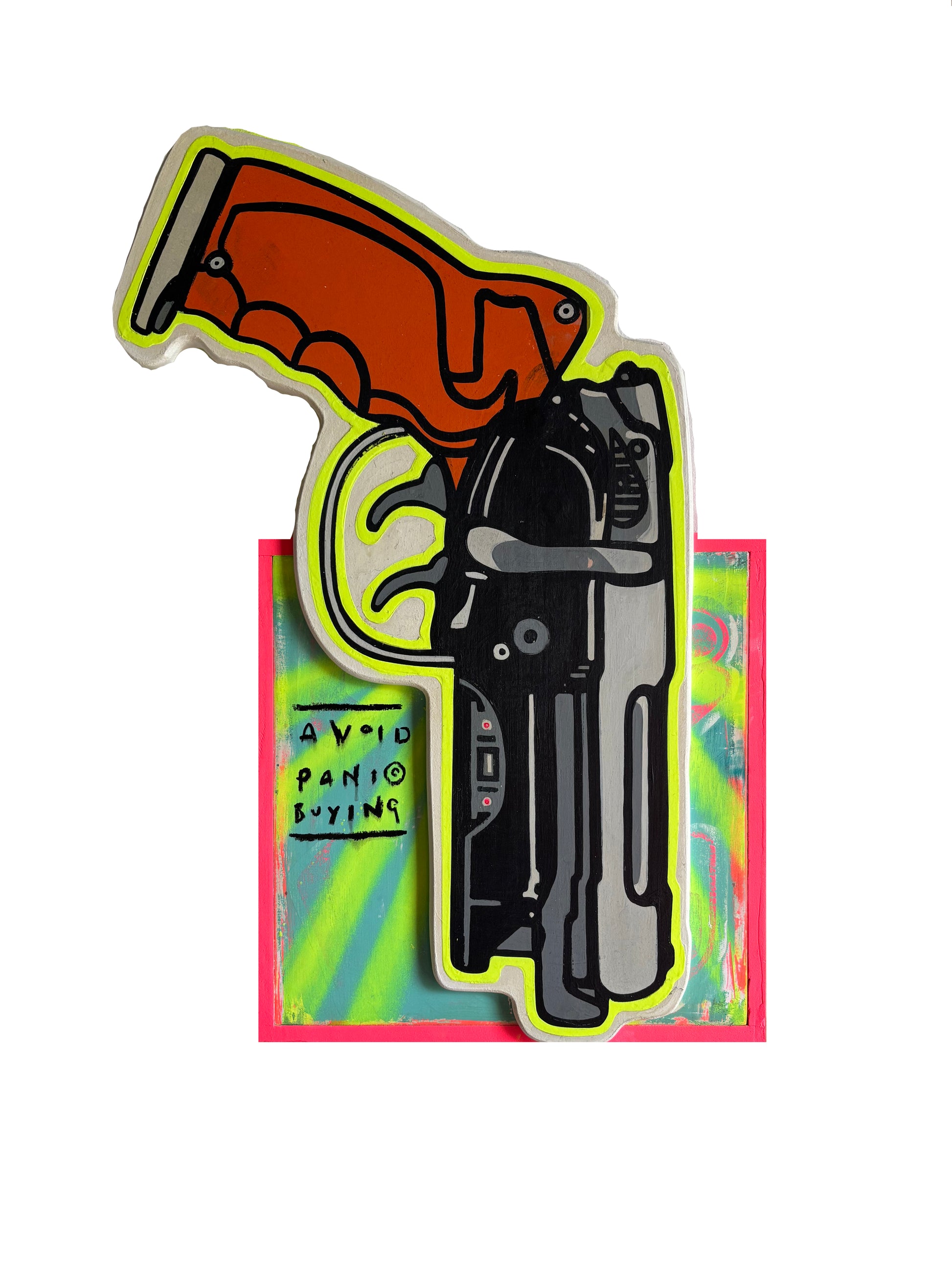 Acrylic, spray paint, oil stick on cut-out and assembled board
