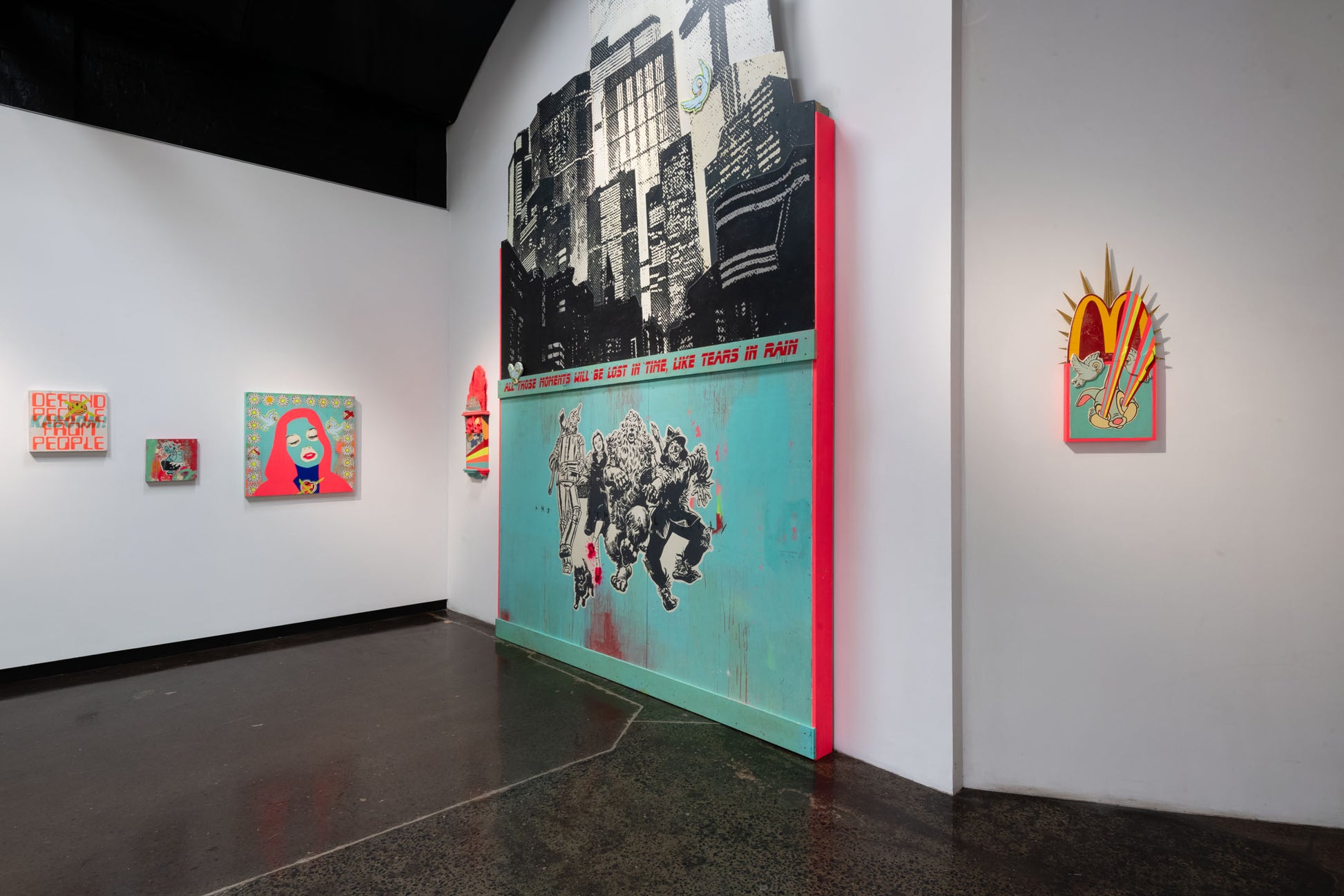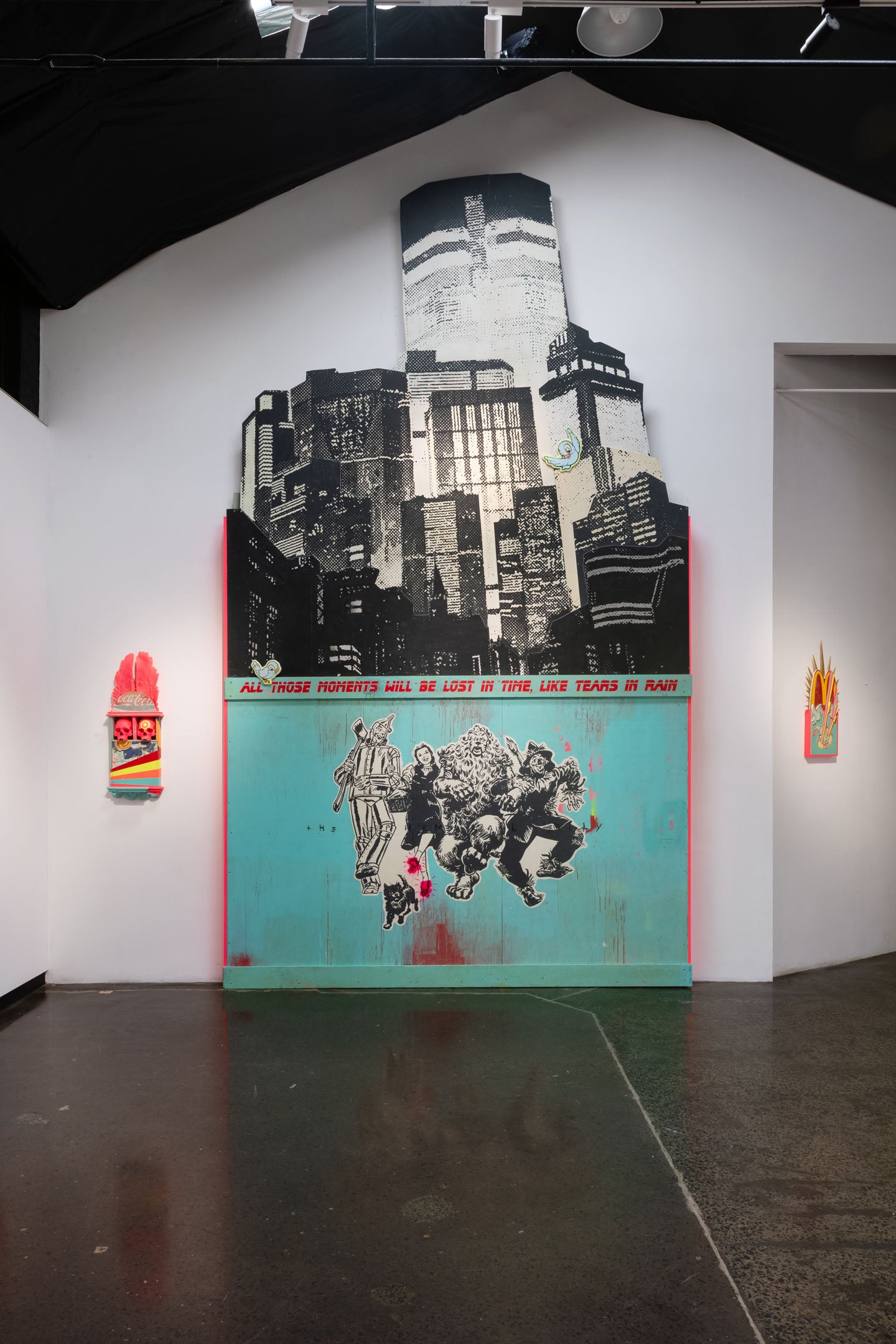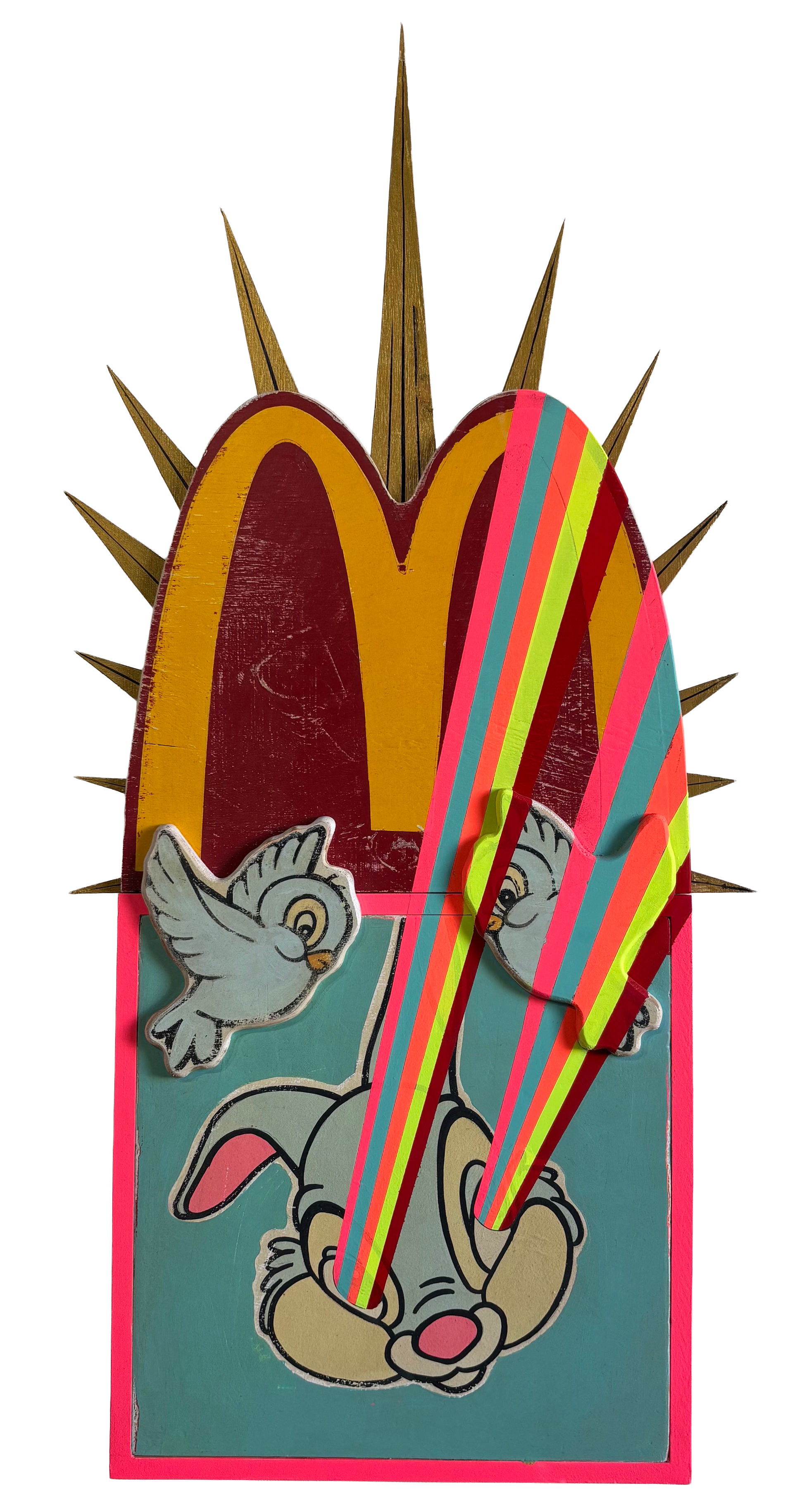 Acrylic, spray paint and polyurethane on assembled board and timber